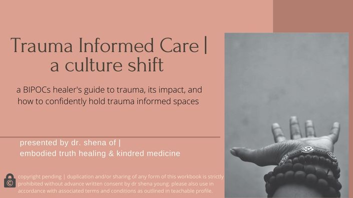 I'm so excited about all the work we will do together and in our communities. I have a few recommendations as you familiarize yourself with the offerings here. beginning with the trauma informed care course is a good look & strong foundation. we will continue expanding this with time. and keep an eye out for opportunities to deepen + integrate in multidisciplinary consultation gatherings with other BIPOC healers.